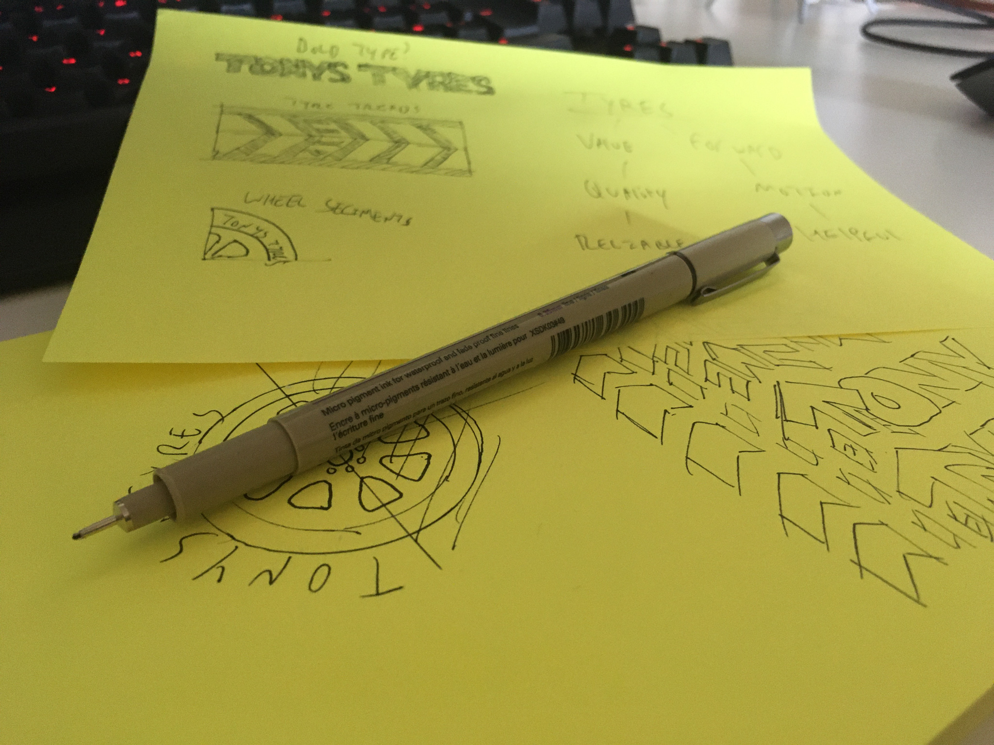 In this example, a fictitious company, "Tony's Tyres", would like a new logo designing. We discuss with them what they want from a logo, where it will be used and who their audience is. While discussing, we take notes and draw sketches of basic ideas.